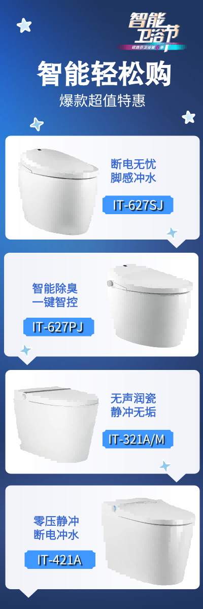 本次活動(dòng)推出的爆款智能馬桶IT-627SJ在原來(lái)IT-627S的基礎(chǔ)上進(jìn)行了升級(jí),不僅功能配置有所大幅度提升,而且價(jià)格更加親民,同步超多智能馬桶、浴室柜、花灑、五金、淋浴房、浴缸、桑拿房等限時(shí)抄底價(jià),讓每一位消費(fèi)者體驗(yàn)智能輕松購(gòu)得“勁爽”,讓客戶(hù)們裝得省心,用得放心!