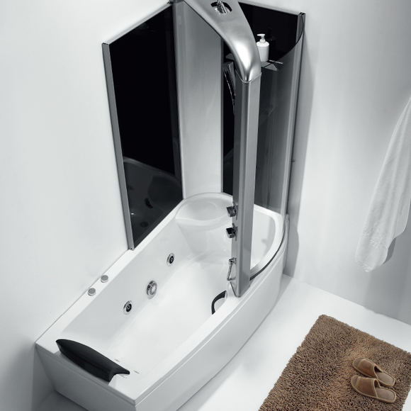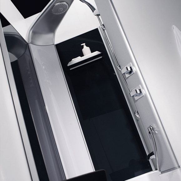 亮銀淋浴柱、深灰玻璃背板、置物架、頂噴、花灑、背噴、進(jìn)水器、五金龍頭